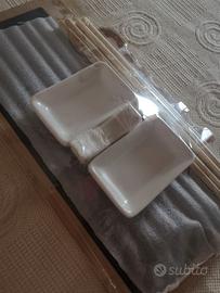 Vendo mini set da Sushi per 2 persone, il set comprende 2 bacchette, 2 porta salse (credo) in ceramica con i loro supporti e il tagliere con interno di pietra, ancora nuovo e imballato (come si vede dalle foto).