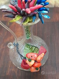 mini vaso in vetro soffiato fiori finti mentre decorazione centrale e fogliolina e in vetro tutto integro misura 7 cm