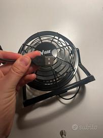 Piccolo ventilatore con uscita USB. Da appoggiare ad esempio alla scrivania, in casa o in ufficio.