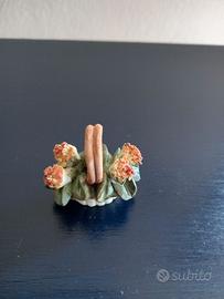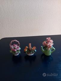 Vendo due piccoli cesti e una caffettiera in miniatura contenenti piccoli fiori o piante in porcellana Capodimonte.
