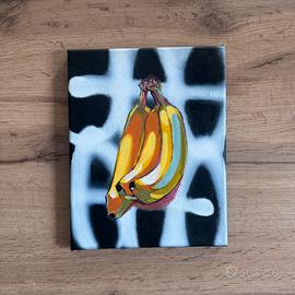 "Un affascinante dipinto di arte moderna che fonde graffiti e banane, scolpito con dettagli realistici in toni di giallo, marrone, verde, bianco, con vivaci graffiti astratti di bianco. Le linee spezzate e i motivi geometrici, che si intrecciano sullo sfondo, creano un contrasto dinamico, dando vita a un'opera che unisce l'eleganza della tradizione scultorea con l'energia urbana contemporanea."