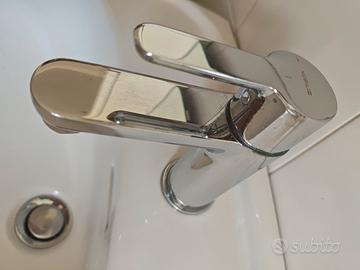 Rubinetto usato una decina di anni, qualche imperfezione nella cromatura. Con piletta di scarico e asta. Manca il tappo.
