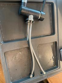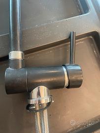 rubinetto Elleci Danubio in Granitek Nero. Progettato per cucine con lavelli posizionati sotto una finestra, il suo meccanismo ribaltabile consente di abbassare facilmente il rubinetto, garantendo praticità senza rinunciare al comfort.