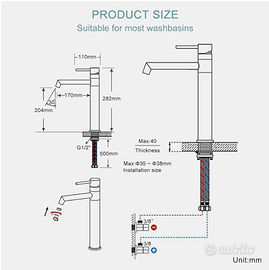 Altezza sotto beccuccio 204mm, lunghezza beccuccio 170mm, altezza totale 282mm. Confezione aperta per verifica prodotto