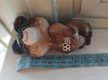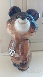 Statuina in ceramica smaltata rappresentante l'orsetto Misha, mascotte dei Giochi Olimpici di Mosca del 1980. La statuina è un iconico cimelio da collezione dello spirito olimpico e della cultura russa, la cintura con i cinque cerchi Olimpici è la caratteristica distintiva di Misha, il cui nome completo è Mikhaol Potapych Totygin ed è stato ideato dall'illustratore Viktor Cizikov. I simboli rossi alla base rappresentano il marchio di fabbrica della statuina, che rimandano probabilmente alla fabbrica di porcellana Lomonosov oppure Dmitrov; il simbolo pentagonale riportava la scritta "CCCP" (URSS) ed era il marchio di qualità dell'Unione Sovietica per i beni di consumo di qualità. I numeri rappresentano il prezzo originale in rubli sovietici. La statuina è alta circa 12 cm