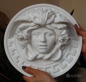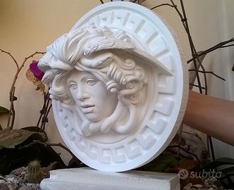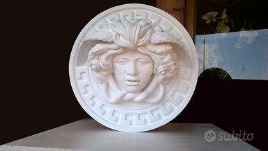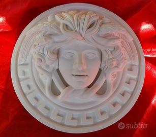 Scultura della mitologia di Medusa, "protettrice", "guardiana". Opera scultorea di Medusa modello con antica greca in stile tipo Versace, pronta da appendere con aggancio sul retro, interamente lavorata a mano dall'artista, firmata, bianca tipo biscuit in purissimo gesso alabastro italiano, diametro 30 cm.