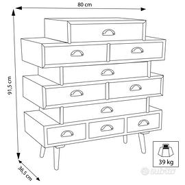 Acquistato ad agosto 2023 a 229 euro (come da foto) e in perfetto stato, come nuovo. Cambiamo per cambio arredo. Effetto vintage. Acquistato su Maison du monde. Nome prodotto Milani Home Adeline - Mobiletto 10 cassetti in mdf multicolore 80x36,5x91,5 cm