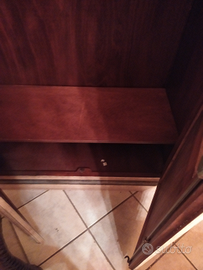 Mobile in legno con decori. Ha un'asta per aggancio grucce e un piano di appoggio, più il piano di fondo del mobile. Misure 108L x 184A il fianco è largo 47cm. Queste sono le misure senza contare la sporgenza dei cornicioni (sopra e sotto). Cornicione sopra alto 9cm, sporge di circa 3cm dalla linea del mobile. Il cornicione sotto è alto 10cm e soprge di 4cm. Il mobile poggia sul cornicione e non ha piedi.
