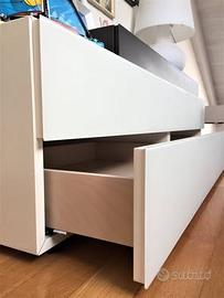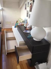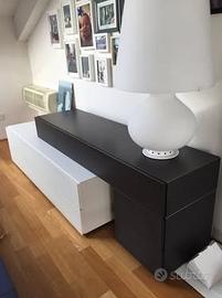 LAGO DESIGN CONTENITORE A CASSETTI 36e8 costituito da due elementi: -uno bianco laccato opaco a due cassetti con fronte in vetro opaco su cui poggia -l'altro in rovere grigio come il Letto YangC a 4 cassetti, uno grande e tre mini. L'ingombro varia facendoli scivolare uno sull'altro a seconda delle necessità e del gusto. I cassetti si richiudono a spinta ammortizzata. 36e8 è il sistema Lago basato su moduli quadrati di 36,8cm per composizioni su misura. Misure elemento bianco: Larghezza 147,2 cm Profondità 56 cm Altezza 38,5 Misure elemento grigio: Larghezza 147,2 cm Profondità 40,5 cm Altezza 57,5 cm Larghezza cassetti 36,8 cm Conservato come nuovo.