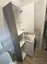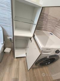 Composto da un'anta superiore e una inferiore, con un vano aperto centrale per esporre oggetti o profumi su ripiano in vetro.