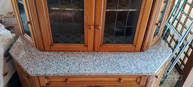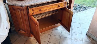 Mobile a credenza composto da diverse parti: blocco superiore composto da blocco centrale e due parti diagonali ai lati (con antine in vetro semi-opaco); blocco inferiore segue lo stesso disegno della parte sopra ma le ante sono in legno. Totalmente realizzato in legno con zoccolo + cornice superiore. Presenta una ripiano in marmo. Aprendo le antine ci sono i diversi ripiani. Mobile conservato molto bene e venduto per cambio mobilio. Il trasporto è facile in quanto è smontabile a blocchi. Per le misure guardare il disegno pubblicato tra le foto. Prezzo trattabile.