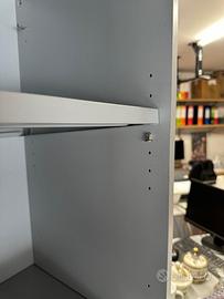 Mobile a giorno ( scaffale) colore grigio in legno con piedini in legno a quattro ripiani in ferro con viti che si possono posizionare in varie altezze le viti bloccano il ripiano