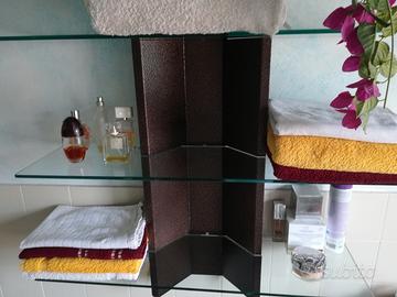 Mobile a parete composto da 4 mensole in vetro con struttura centrale in metallo battuto. Adatto per bagni o altri ambienti