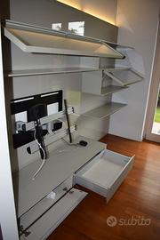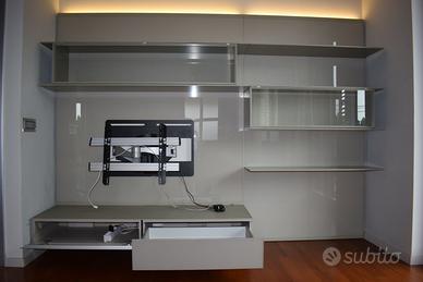 Si compone di una boiserie di vetro laccato colore tortora in cui si innestano contenitori interamente in vetro con cassetti, mensole di sottilissimo spessore e vetrine con ante a ribalta. Gli schienali sono dotati di sistema di illuminazione a led nella parte superiore. Dotato di braccio snodabile per TV Misure L. 2,69 (diviso in due parti da m. 1,69 e m. 1,00) H. m. 1,97, profondità cassettiere cm. 50. PREZZO DA CONCORDARE
