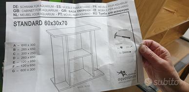 Vendo mobile per acquario NUOVO, ancora imballato e da montare, perfetto per vasche standard da 60 cm di lunghezza, 30 cm di profondità e con un'altezza ideale di 70 cm.