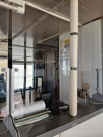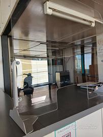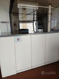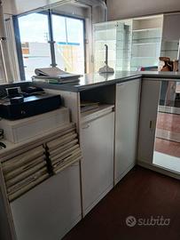 mobile ad angolo diviso in due parti colore bianco con il piano grigio ottimo per l'accettazione clienti o altro misure: la parte con vetrinetta lunghezza 137x38 profondità. la parte con gli scomparti 190x63 entrambe altezza 106 sul piano due plexiglass a protezione virus. comprese nel costo non si effettuano spedizioni pagamento in contanti o con bonifico