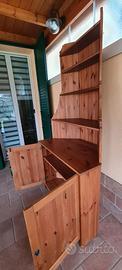 Mobile angolare in legno di pino, con parte inferiore chiusa da antine e ripiani a vista sulla parte superiore. Colore legno naturale, lavorato sui bordi, di dimensioni: larghezza max. 95, profondità max. 54, altezza 198 . Mobile usato ma in buono stato. Preferibile ritiro sul posto o disponibile a consegna, massimo 50Km e montaggio: importo da concordare.