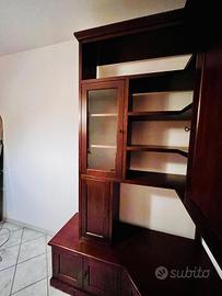 Vendo per cambio arredo un elegante e robusto mobile d'angolo con finitura scura in stile Noce/Ciliegio. Il mobile è composto da una spaziosa credenza inferiore (con ante e cassetti) e un'alzata superiore che funge da libreria aperta e vetrinetta con anta in vetro.