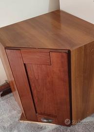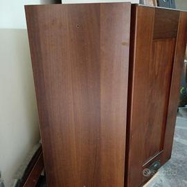 Design: Presenta una struttura a tre pannelli frontali con un'anta centrale dotata di maniglia. Materiale: Legno in tonalità noce scuro. Stile: Molti modelli simili risalgono alla produzione di modernariato degli anni '70 e '80. Utilizzo: Può fungere da base per mobili da cucina, mobile porta telefono o piccola credenza angolare