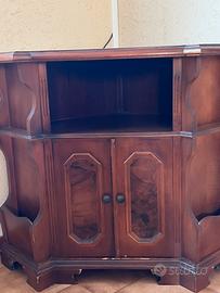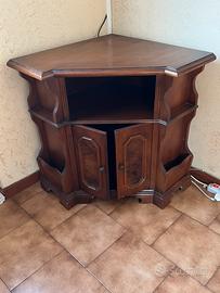 Questo mobile è un'angoliera vintage in legno, prodotta tra gli anni '50 e '70, spesso utilizzata come porta TV o portariviste.
