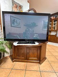 Imponente mobile angolare porta TV in legno massello con vetrata stained glass floreale unica (altezza totale ~1,80 m+), struttura curva policroma che unisce base solida, ante e ripiani regolabili.