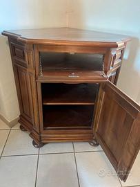 Vendiamo un mobile triangolare porta tv in stile barocco piemontese per un salotto elegante e classico o per una rivisitazione moderna, di legno massiccio colore noce, di produzione locale di fine secolo novecento a 180 €.