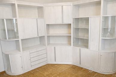 Mobile angolare (può anche essere disposto dritto lungo tutta una parete) in buono stato, perfetto per chi cerca spazio e un tocco di design. È molto capiente, dotato di ante, alcune in vetro, e cassetti, ideale per la zona living o sala da pranzo (si adatta bene a diversi tipi di arredamento). Il mobile viene venduto nella sua colorazione originale scura (come da prima foto). Tuttavia per gli amanti dello stile Shabby Chic, nella foto successiva è possibile vedere una simulazione realistica di come appare il mobile rivisitato in una moderna combinazione Visione e ritiro a Porto Torres.