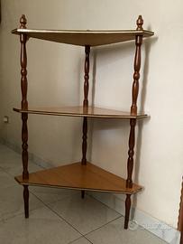 Angoliera modernariato tipica degli anni '70! in formica rivestita colore marrone con venature, tipico di quegli anni. Composta di 3 ripiani a vista. Oggetto relativamente leggero ma ben stabile.Diametro angolo 62 cm.Profondità 37cm.Altezza 96 cm.Lato angolo 44cm. Smusso 7cm.Possibilità di visionare l'oggetto in loco previo appuntamento.