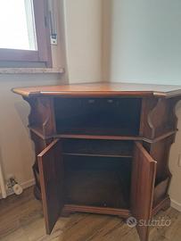 Vendesi elegante mobile angoliera in legno massiccio, perfetto per ottimizzare gli spazi negli angoli della casa. Il mobile si presenta in buone condizioni generali e si distingue per i raffinati decori intagliati sulle ante che richiamano uno stile classico/tradizionale.