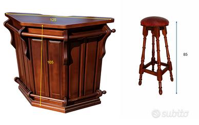 Vendo elegante mobile angolo bar in legno, ideale per taverna, soggiorno, sala hobby o locale in stile rustico/classico. Completo di mensole laterali, cassetti e comodo piano d’appoggio, è un pezzo funzionale. Compresi nel prezzo anche i due sgabelli abbinati. Spedizione a carico dell'acquirente