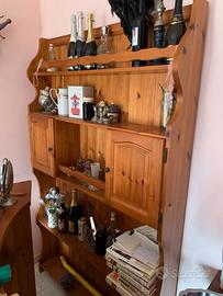 Zona bar con piattaia, elementi composti interamente da legno di pino massello. Il bancone è formato nella parte interna da due ripiani, uno sul fondo e uno a mezza altezza, che lo rendono pratico ed efficiente. La piattaia, l’elemento posto sul fondo, è un mobile composto da antine, ripiani dalla testa ai piedi, che rende pratica e comoda la disposizione di bottiglie, bicchieri e tutto il necessario per rendere l’angolo bar un posto accogliente e ben attrezzato.