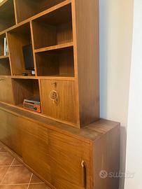 Mobile di modernariato, anni '60, stile 'svedese', in legno, composto da due pezzi sovrapposti: la parte bassa misura 2 metri di lunghezza, 80 cm di altezza e 50 cm di profondità; la parte soprastante misura 160 cm lunghezza, 123 cm di altezza e 30 cm di profondità, per un totale di altezza di circa 2 metri. La parte bassa ha due ante ad apertura scorrevole e internamente ha, da un lato 4 cassetti e dall'altro due scaffali; la parte alta ha scomparti aperti e due chiusi con apertura dall'alto verso il basso. Ritiro secondo piano senza ascensore, Napoli zona corso Vittorio Emanuele