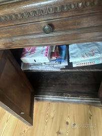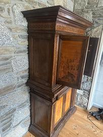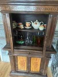 Splendido mobile antico in legno massello, finemente lavorato e ricco di dettagli artigianali. Struttura solida e imponente, con decorazioni intarsiate sia sulla cornice superiore che sulle ante. Caratteristiche principali: •Intarsi decorativi geometrici e floreali lungo tutta la struttura •Ante superiori con raffigurazioni paesaggistiche incise (molto scenografiche) •Vano centrale con doppia anta e ripiano interno (ideale per bicchieri, servizi o bottiglie) •Cassetto centrale funzionale •Parte inferiore con ulteriore spazio contenitivo •Legno in ottime condizioni, segni del tempo che ne aumentano il fascino Perfetto come: •mobile bar •credenza •pezzo d’arredo importante per soggiorno o taverna Acquistato da un negozio di antiquariato a Volterra, mobile di fine 800. Dimensioni 98x43 cm altezza 1,60 cm, adatto a chi cerca un pezzo di carattere e non un mobile anonimo da catalogo. Prezzo: 800 euro
