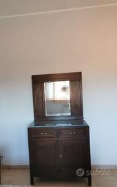 Comò /toilette con specchio in legno massello, con due cassetti superiori, due ante sotto e specchio incorniciato nella parte alta. Stile primi '900 (anni '20-'40). maniglie in ottone lavorato, cornice con decorazioni leggere a intarsio, piano in marmo. MISURE H 187 larghezza 90 profondità 45. Ritiro a Fiuggi