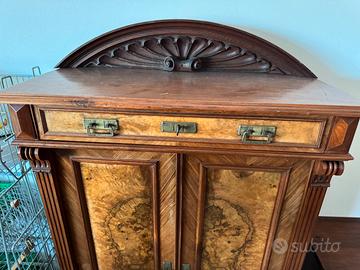 Mobile antico color noce chiaro in radica, cassetto superiore e due ante. Dimensioni lxpxh 97x45x136. Corona posta sulla parte superiore e’ alta 17.5cm. E’ comunque removibile.