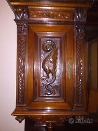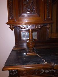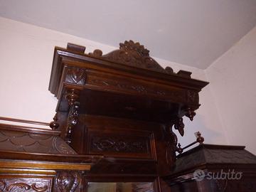 Importante mobile da sala dei primi del '900. Impiallacciato in noce con decorazioni a rilievo. Ripiano in marmo verde (difettoso). Mancano maniglie. Larghezza max 153 cm, profondità 55 cm, altezza totale 270 cm.