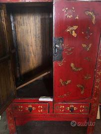Mobile in legno, con finiture magenta e oro, di origine antica e fattezze orientali.
