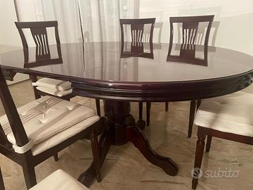 Mobile antico in noce lucido bordeaux, composto da credenza, tavolo estendibile e 6 sedie. Usato ma ben conservato e pronto all'uso, con finiture eleganti e linee classiche. Ideale per arredare con stile e funzionalità. Vendibili anche separatamente: credenza 1.300€, tavolo e 6 sedie 600 €. Trasporto a carico dell'acquirente.