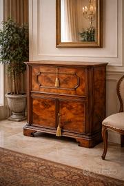 Vendo elegante mobile antico con ribalta, restaurato artigianalmente e rifinito a gommalacca e cera di carnauba, tecniche tradizionali che valorizzano la naturale bellezza del legno. Il mobile si presenta in ottime condizioni, pronto all’uso, con una struttura solida e una finitura calda e lucida. Internamente è presente il piano scrittoio ribaltabile, pratico e funzionale. Ideale per arredare: ingresso soggiorno studio ambiente classico o vintage 📏 Dimensioni Altezza: 89 cm Larghezza: 85 cm Profondità: 39 cm 🪵 Condizioni Mobile in ottimo stato, restaurato e pronto all’uso. Normali segni del tempo coerenti con l’età, che ne aumentano il fascino autentico. 🚚 Spedizione Imballaggio accurato e sicuro