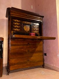 Articolo secrétaire Biedermeier del fine 800 intarsiato con motivi floreali e vegetali in legno pregiato di noce.