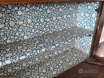 Punto di Forza: Interno rivestito con un'elegante stoffa fantasia floreale blu/crema e suddiviso in due pratici ripiani.