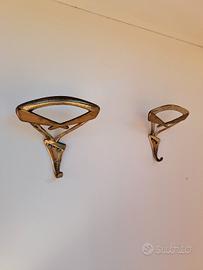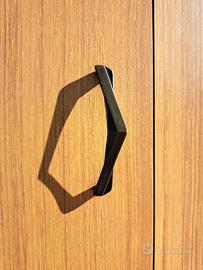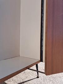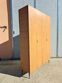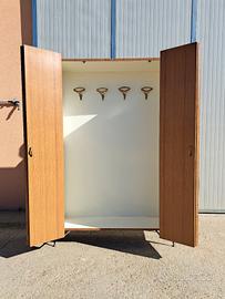 Armadio appendiabiti da ingresso o corridoio con doppia anta a soffietto, produzione anni 60, in legno impiallacciato e zampe in ferro e ottone. Colore marrone chiaro con interno bianco e inserti come maniglie e appendini in metallo dorato. Un guardaroba chiuso da ante e con 4 appendini comodo per riporre cappotti e scarpe. Buone condizioni generali con leggeri segni del tempo, si consiglia un ancoraggio al muro (è presente un piccolo gancio in alto sul retro) per evitare che l'apertura delle ante sbilanci il mobile in avanti. 115 x 34,5 x 169 cm disponibile a Olmo di Martellago