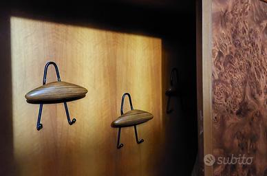 Mobile artigianale da ingresso con appendiabiti & scarpiera in legno e rivestimento in radica d'olmo.