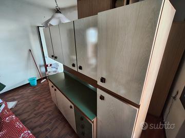 Ritiro solo a mano Mobile, armadio, scaffale credenza, dispensa in legno vintage. Utile per conservare alimenti o qualsiasi altra cosa. Da arredo casa in cucina o salotto. Con cassetti 4 cassetti, 3 ante basse, 5 ante superiori da pensile e un’anta più grande da inserire un frigo ad incasso interno, con piano di lavoro sempre in legno. Condizioni come da foto, l’interno è in buone condizioni. Basamento e piedini in ferro MISURE: Lungo 2mt Largo 50cm Alto 1.92mt