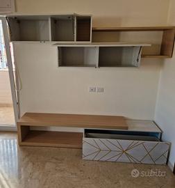 Parete attrezzata usata pochissimo. Condizione nuovo come da foto. Marca 2BITALIA. Superficie in spatolato bianco con decori oro. Parti in legno di noce nordico. Misure: