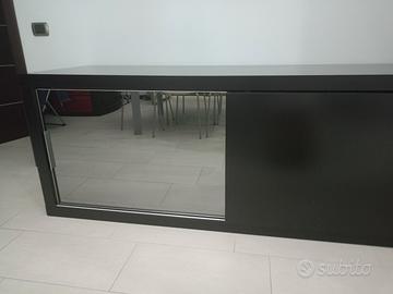Mobile basso Tomasella L192 H76 struttura cassa in rovere moro colore nero fumo laccato opaco + anta a specchio + 2 ripiani interni.
