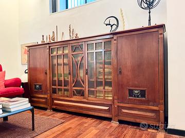 Mobile autentico Art Deco in rovere. 2 ante in legno con 2 teste di leone in bassorilievo. 3 ante in vetrata, di cui quella centrale fissa. All’interno scaffalature in legno. È interamente smontabile perché realizzato ad incastri più 2/4 dadi in ferro.