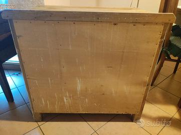 Piano superiore in legno naturale, struttura verniciata in bianco con ferramenta originale in metallo. Presenta segni del tempo che ne valorizzano il carattere rustico, ma è solido e ideale sia come complemento vintage sia come base per restauro shabby chic.