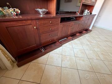 Vendo per rinnovo appartamento un mobile artigianale in legno massello. Molto spazioso, con alcuni piccoli segni di usura ed alcuni graffi più evidenti su una mensola interna coperta dalle ante sotto la tv. Cassetti a scomparsa sulla base, due vetrinette e due cassettiere. Misura delle mensole superiori 32 cm, profondità cassetti e ante inferiori 54 cm. Misure totali 364x60,5x264. Disponibile da subito con smontaggio a carico di chi è interessato.