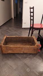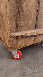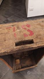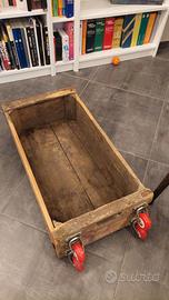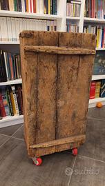 Questo mobile l'ho fatto io, aggiungendo delle rotelle ad un'antica cassa in legno risalente agli anni 30. È infatti molto massiccia, niente a che fare con le cassette della frutta attuali. Può essere usato come contenitore, cassa, mobiletto, io lo usavo per le cassette e CD. Si presta allo stile industriale come a quello più vintage o da casa in montagna o campagna